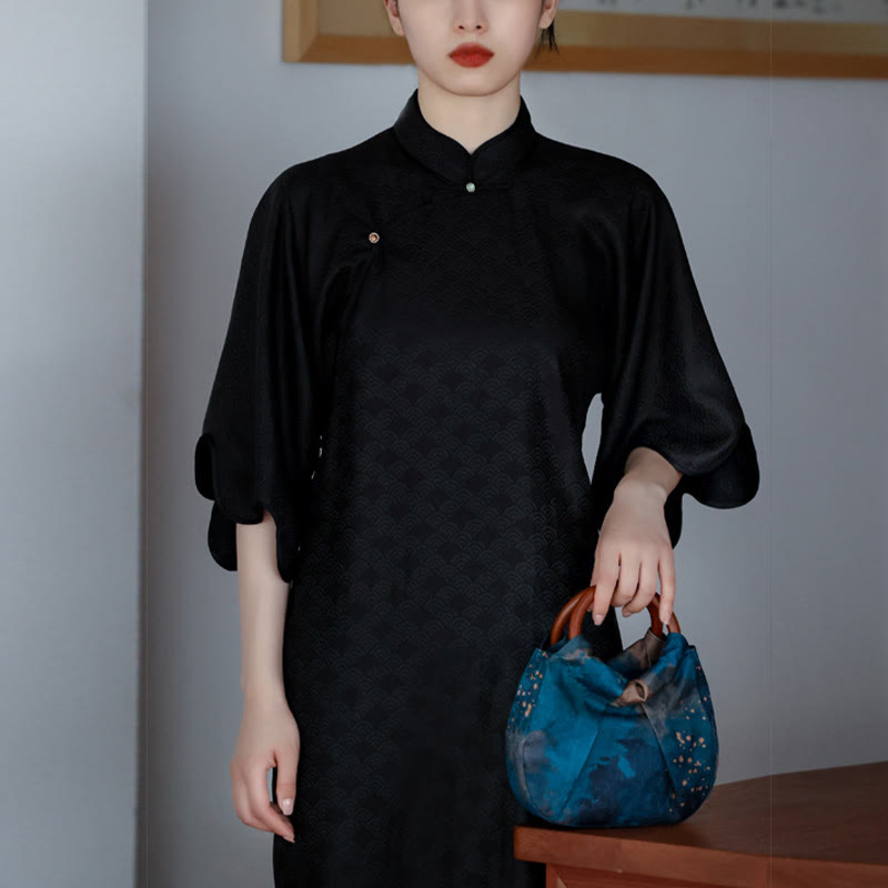 Buddha Stones Handmade Jacquard Flower Blue Wooden Handle Handbag