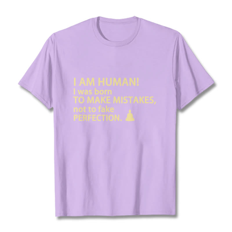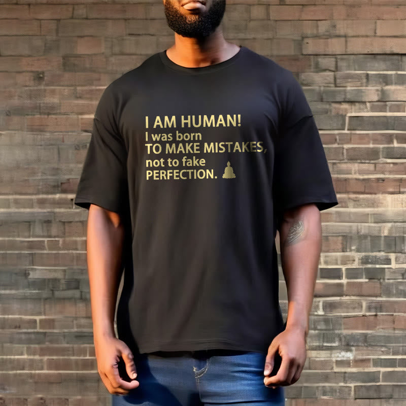 I Am Human Tee T-shirt features the powerful quote, "I am human! I was born to make mistakes, not to fake perfection," alongside a small Buddha image. Crafted from soft cotton, this tee encourages self-acceptance and mindfulness. The message reminds us to embrace our imperfections and personal growth, offering a meaningful reminder of the beauty of being authentically human.