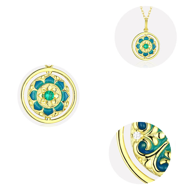 Buddha Stones 925 Sterling Silver Lotus Flower Floral Zircon Enlightenment Rotatable Necklace Pendant