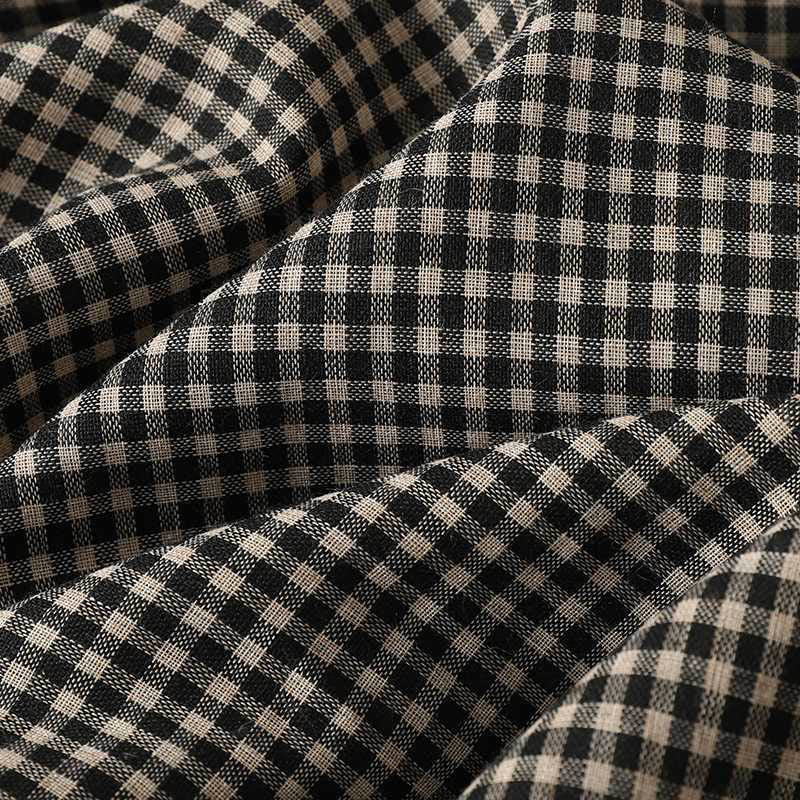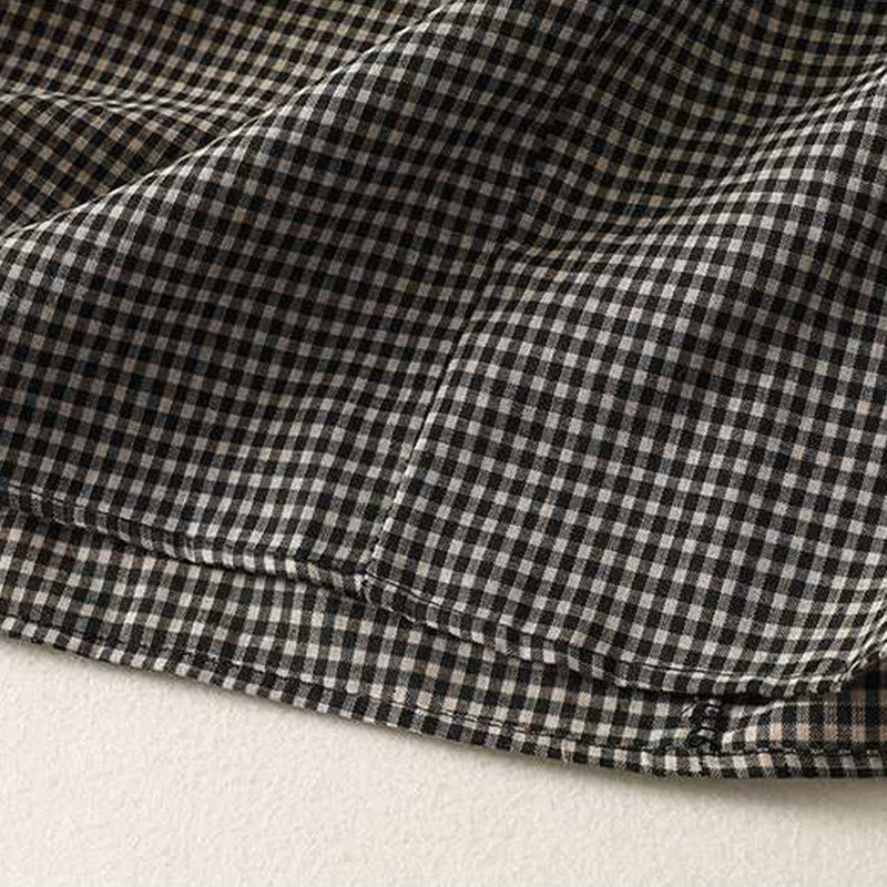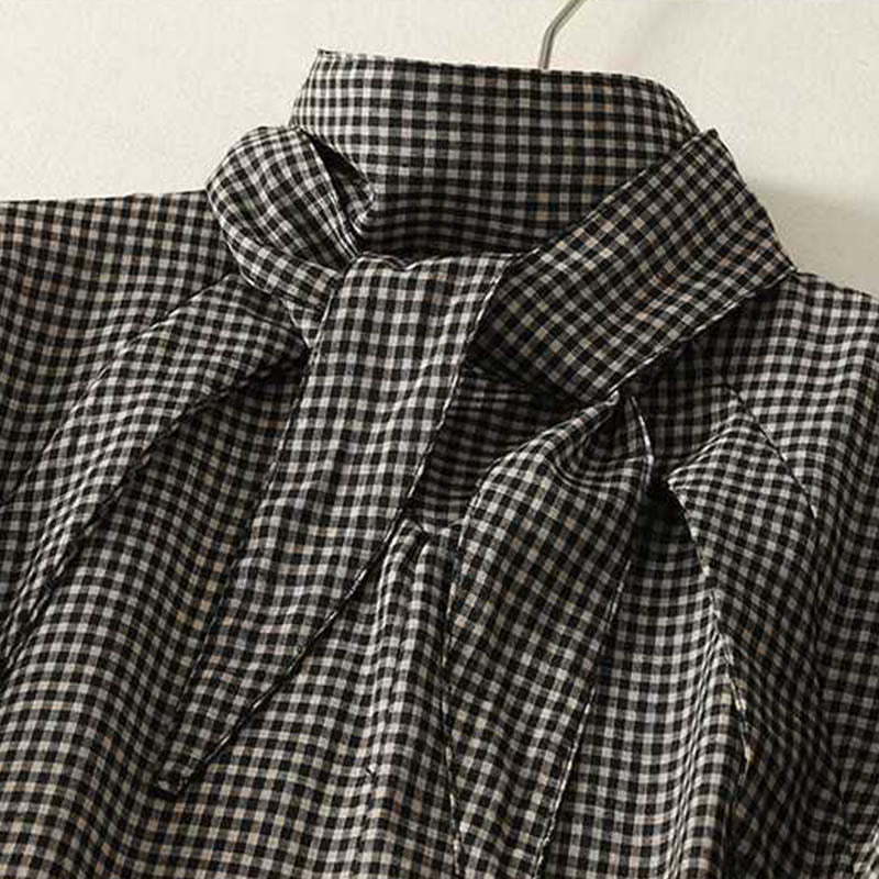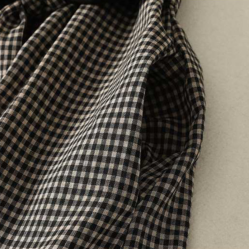 Buddha Stones Fall Black White Plaid High Neck Lace-up Design Long Sleeve Midi Dress With Pockets