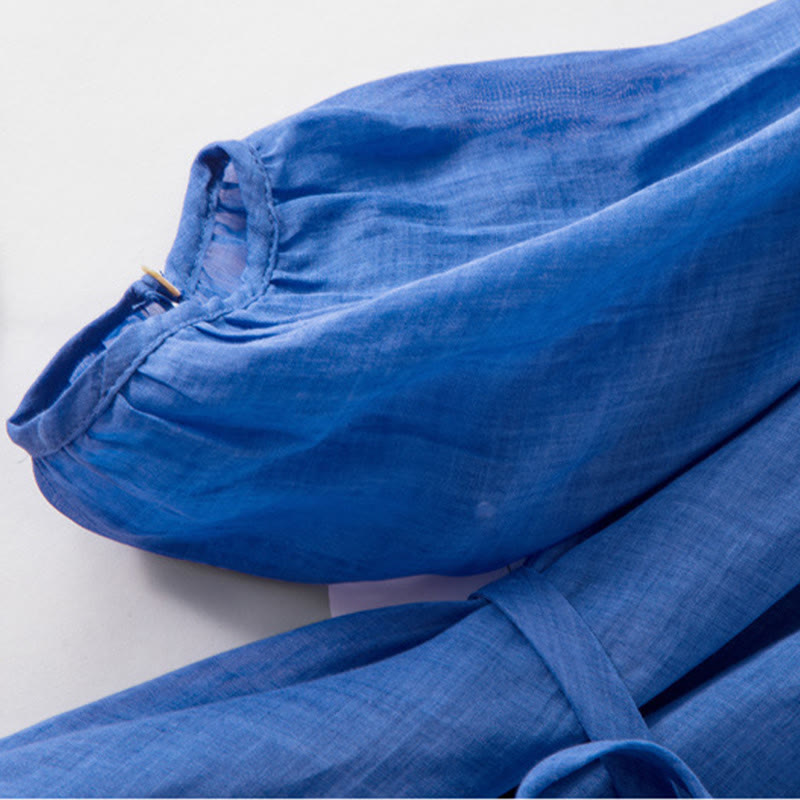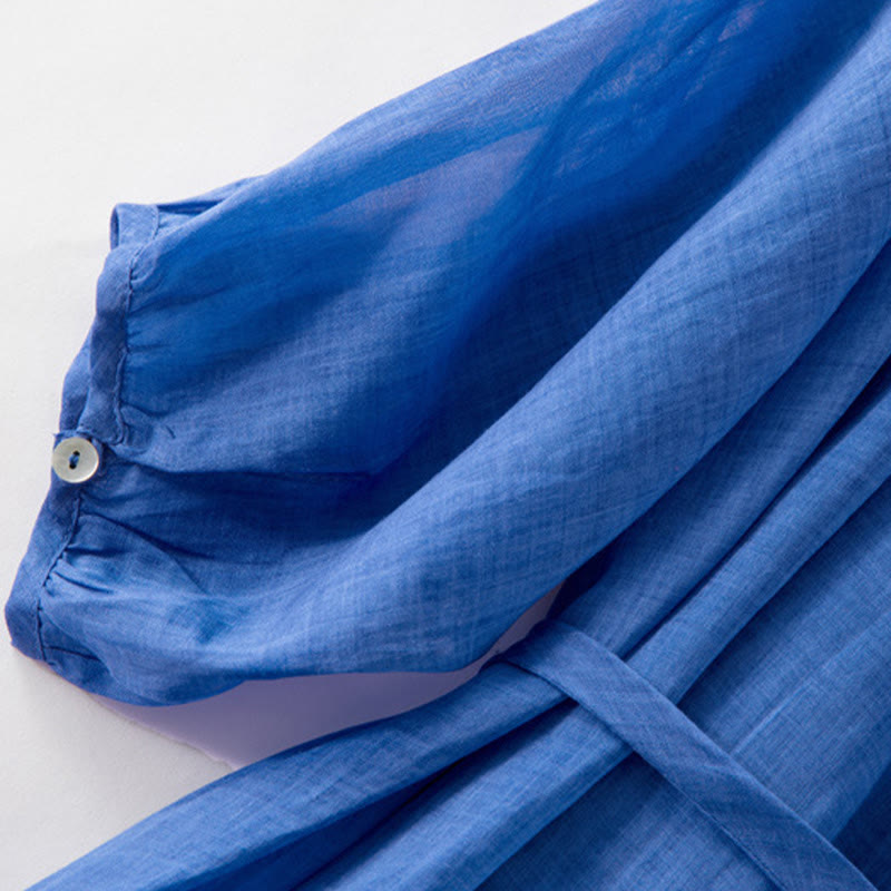 Buddha Stones Plain Drawstring Three Quarter Puff Sleeve Cotton Linen Midi Dress With Pockets - Blue - US12,UK/AU16,EU44 (XL) - image 0