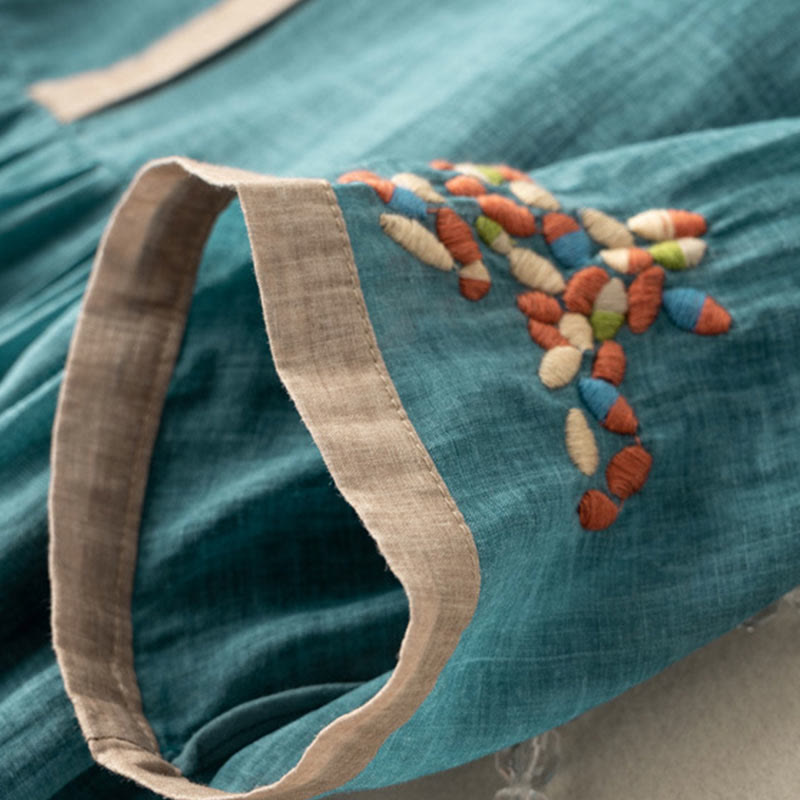 Buddha Stones Spring Ethnic Embroidery Half Sleeve Cotton Linen Women's Midi Dress