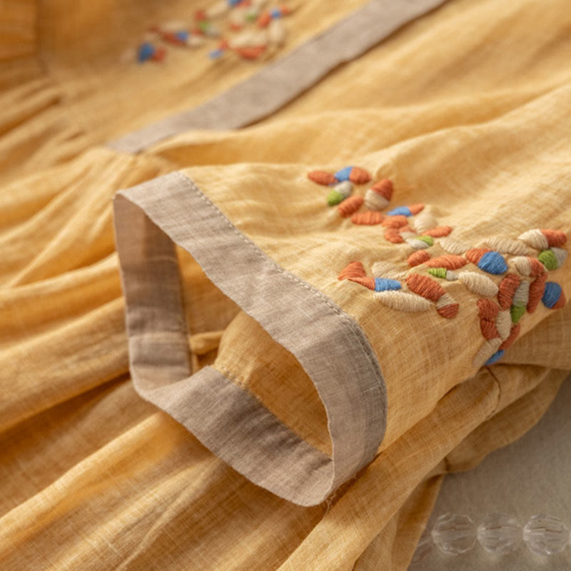 Buddha Stones Spring Ethnic Embroidery Half Sleeve Cotton Linen Women's Midi Dress - Gold - US8-10,UK/AU12-14,EU40-42 (2XL) - image 2