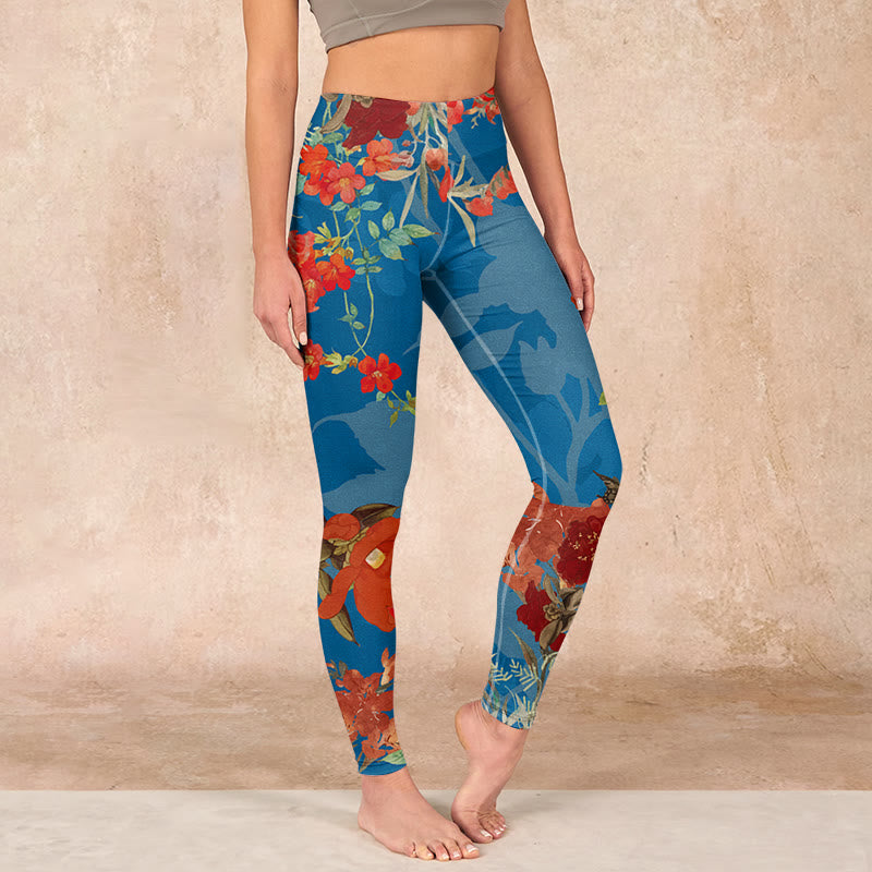 Design Inspiration: The leggings feature a vibrant blue background adorned with red floral and bird motifs, symbolizing vitality and harmony. The blue represents tranquility and depth, while the red flowers and birds convey a sense of passion and joy, creating a lively connection to nature.