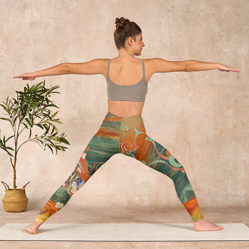 - Design Inspiration: The leggings feature a design of Dunhuang Flying Apsaras, symbolizing grace, beauty, and the ethereal qualities of celestial beings in Buddhist art. These apsaras, often depicted in dynamic poses, represent artistic inspiration and spiritual transcendence, celebrating the rich cultural heritage of Dunhuang and the harmony between art and spirituality.
