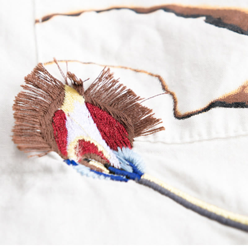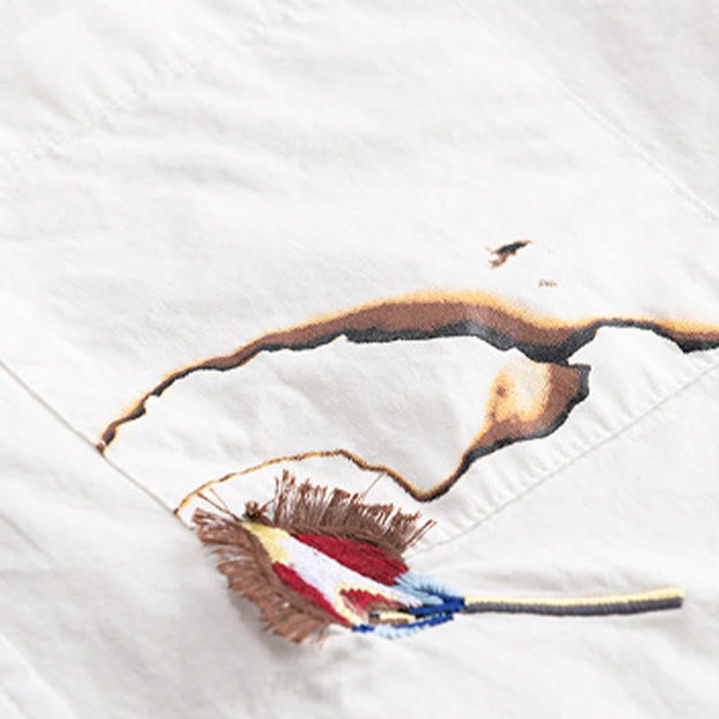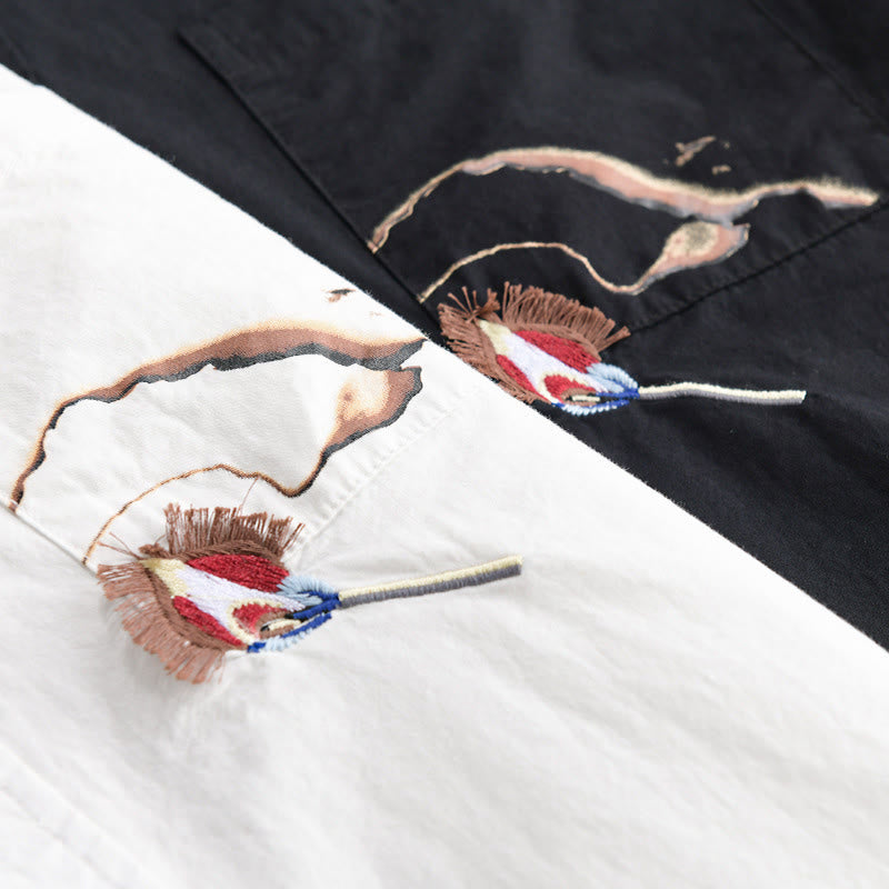 Buddha Stones Summer Buttons Down Bird Embroidery Decorative Pocket Men's Short Sleeve Cotton Shirt