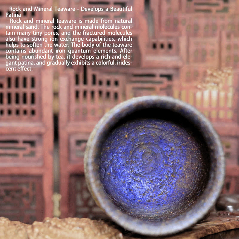 Rock and mineral teaware is made from natural mineral sand. The rock and mineral molecules contain many tiny pores, and the fractured molecules also have strong ion exchange capabilities, which helps to soften the water. The body of the teaware contains abundant iron quantum elements. After being nourished by tea, it develops a rich and elegant patina, and gradually exhibits a colorful, iridescent effect.