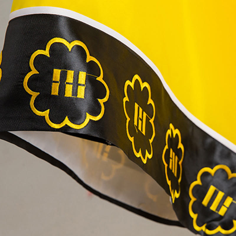 - Vibrant Color & Symbolic Embroidery: The bright fabric is paired with black trim and embroidered auspicious patterns, symbolizing protection, blessings, and spiritual harmony.