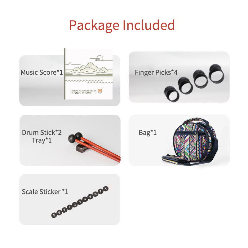 - Package: Manual*1, Scale Sticker *1, Drum Stick*2, Tray*1, Bag*1, Drum*1, Finger Picks*4